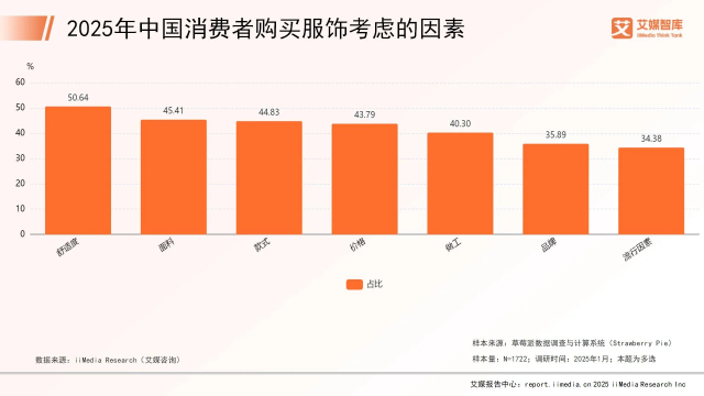 在当下这个追求个性与舒适并存的时代,“买好裤”似乎成了一场需要精心博弈的较量。根据艾媒智库《2025年中国服饰产品消费行为调查数据》的洞察,舒适度以压倒性的优势成为消费者选购服饰时的首要考量,占比高达50.64%。与此同时,面料(45.41%)和款式(44.83%)的占比也遥遥领先,这意味着现代消费者对“好穿”的执着追求,并且不愿意再为“好看”妥协,而是要求服饰真正“贴合身体”。
