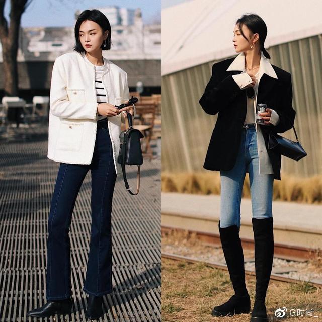 除了短靴,我们还可尝试一下长靴与牛仔裤的搭配。如果你的腿上赘肉较多,那就可选择裤腿宽松一些的牛仔喇叭裤、牛仔阔腿裤搭配中筒靴,能在为腿部塑形的同时遮住腿上赘肉。可若是你更喜欢显腿细一些的穿法,那就可以用紧身裤搭配中筒靴或是过膝靴,将裤腿塞进靴筒中,不仅可以为你的腿部进行二次塑形,还能凸显出小细腿的优势。