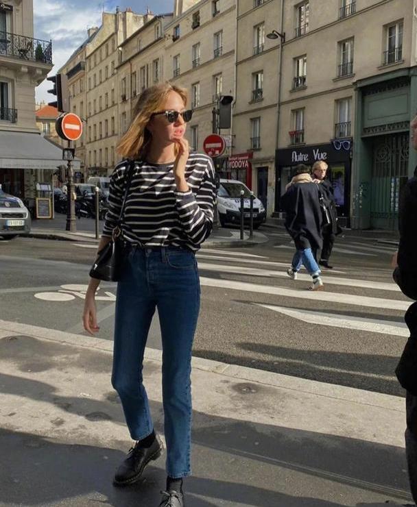 除了基础白T外,条纹T恤也是很耐看经典的选择,毕竟条纹衫作为集经典、复古与时髦于一身的单品,无论什么时候都不会过时。