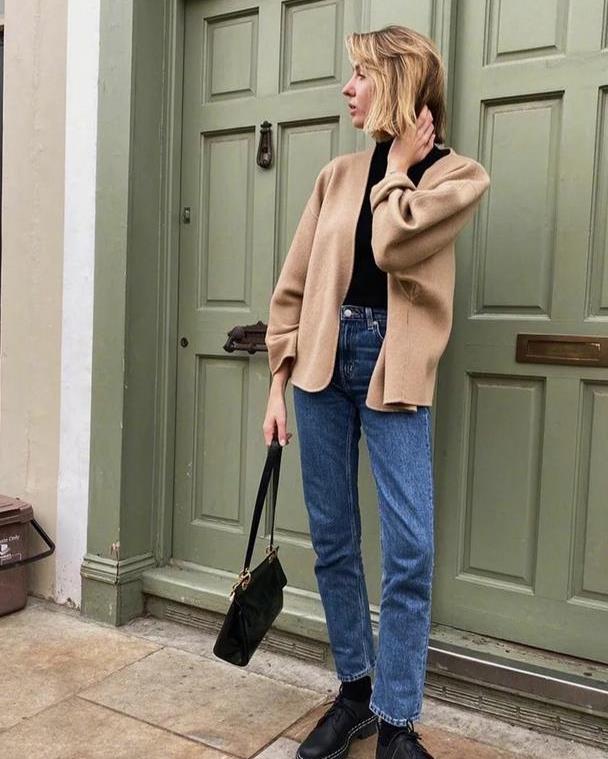 早秋大地色系必不可少,毕竟没有比大地色系更优雅质感的色系了,如大地色系西装、衬衫、风衣或者开衫等等。这件大地色系开衫叠穿黑色系打底衫和高腰紧身直筒裤,英伦小皮鞋提升帅气与酷感,造型简约却不失高级。