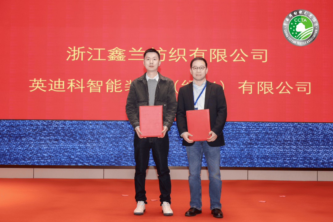 会上,浙江鑫兰纺织有限公司与英迪科智能装备有限公司签约,引进浙江首台靛蓝电解设备,将为牛仔布产业的绿色生产注入新动能。