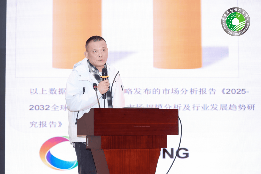 江苏新瑞贝生物科技股份有限公司副董事长林源杰介绍了生物基浆染助剂的应用。该系列产品能有效降低牛仔布浆染环节的化学药剂使用量,综合成本较传统化工产品低10%以上。