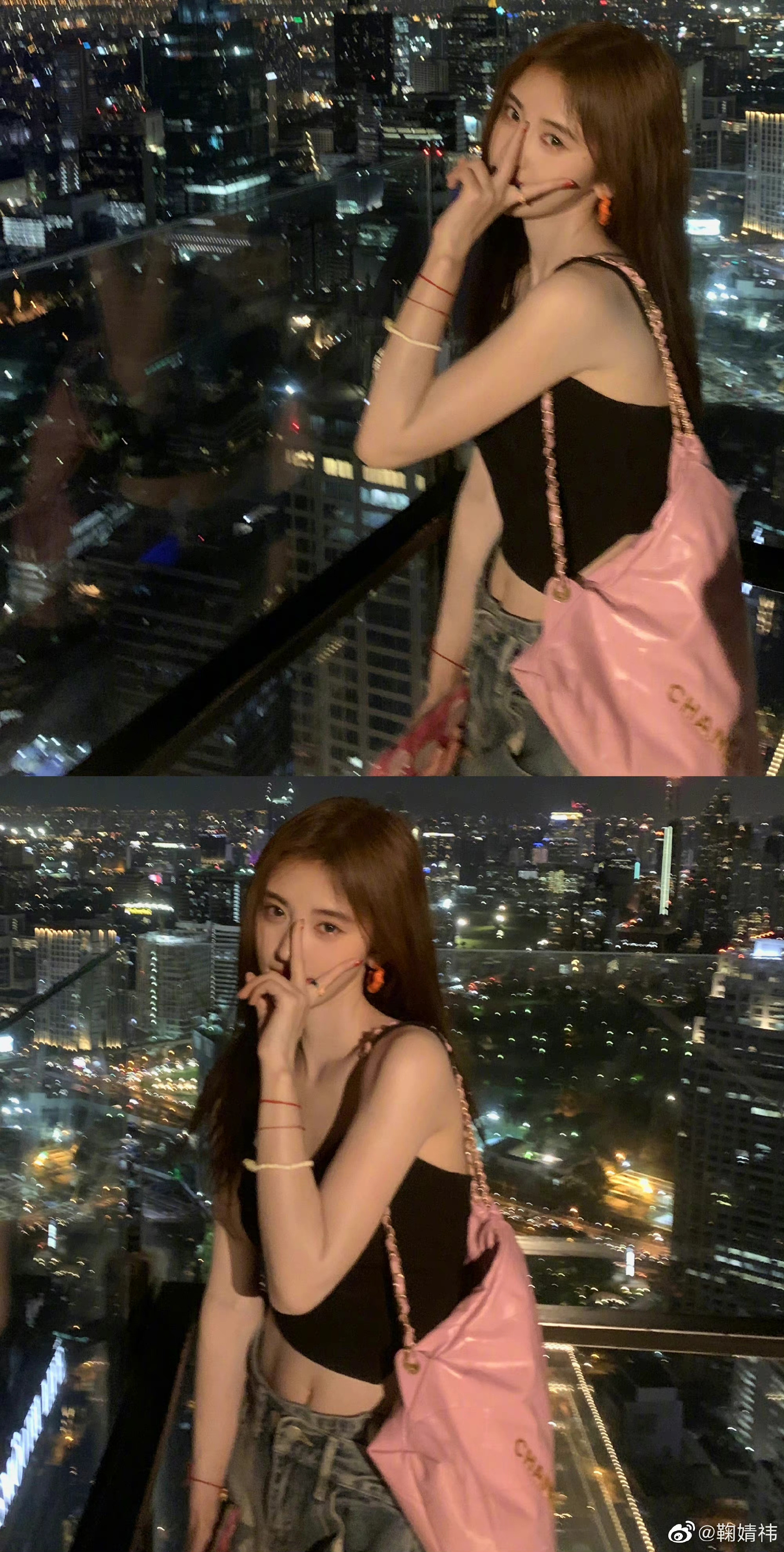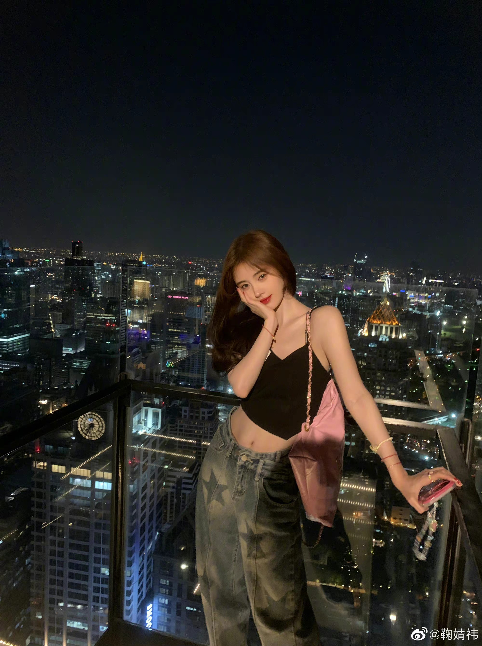 鞠婧祎夜景随拍,黑色吊带牛仔裤,甜辣小鞠出现