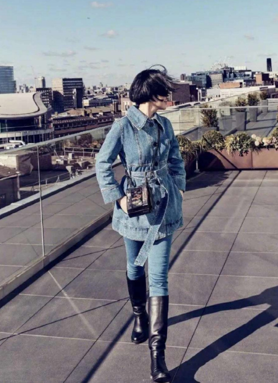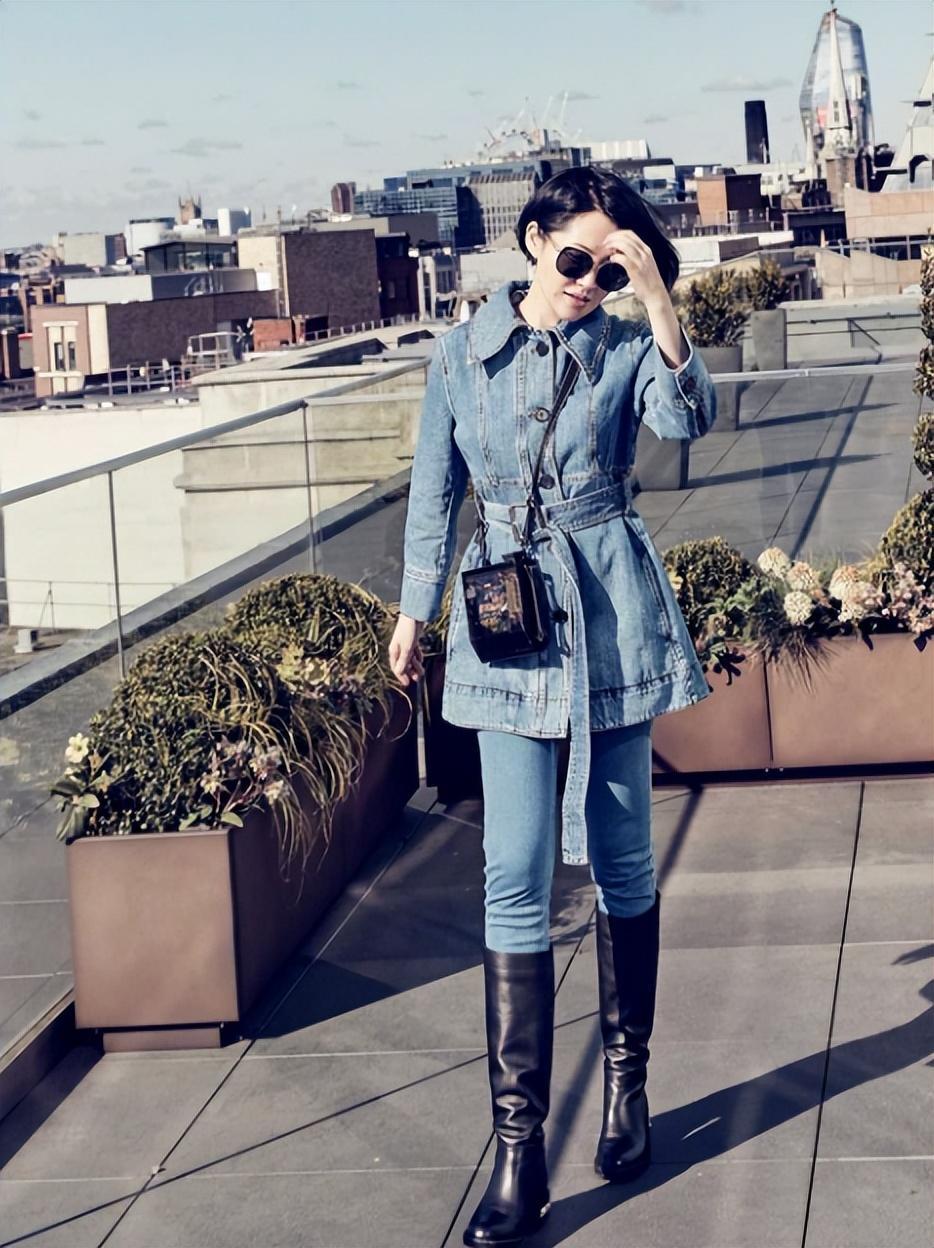 牛仔外套较为宽松,所以建议大家尝试一些腰带搭配,例如许晴选择了长款的牛仔外套,腰间系上了一根腰带,这根腰带的作用可不小。腰带强调了董洁的腰线,区分了上下身,人为的拔高了腿长,优化了身材的视觉效果。